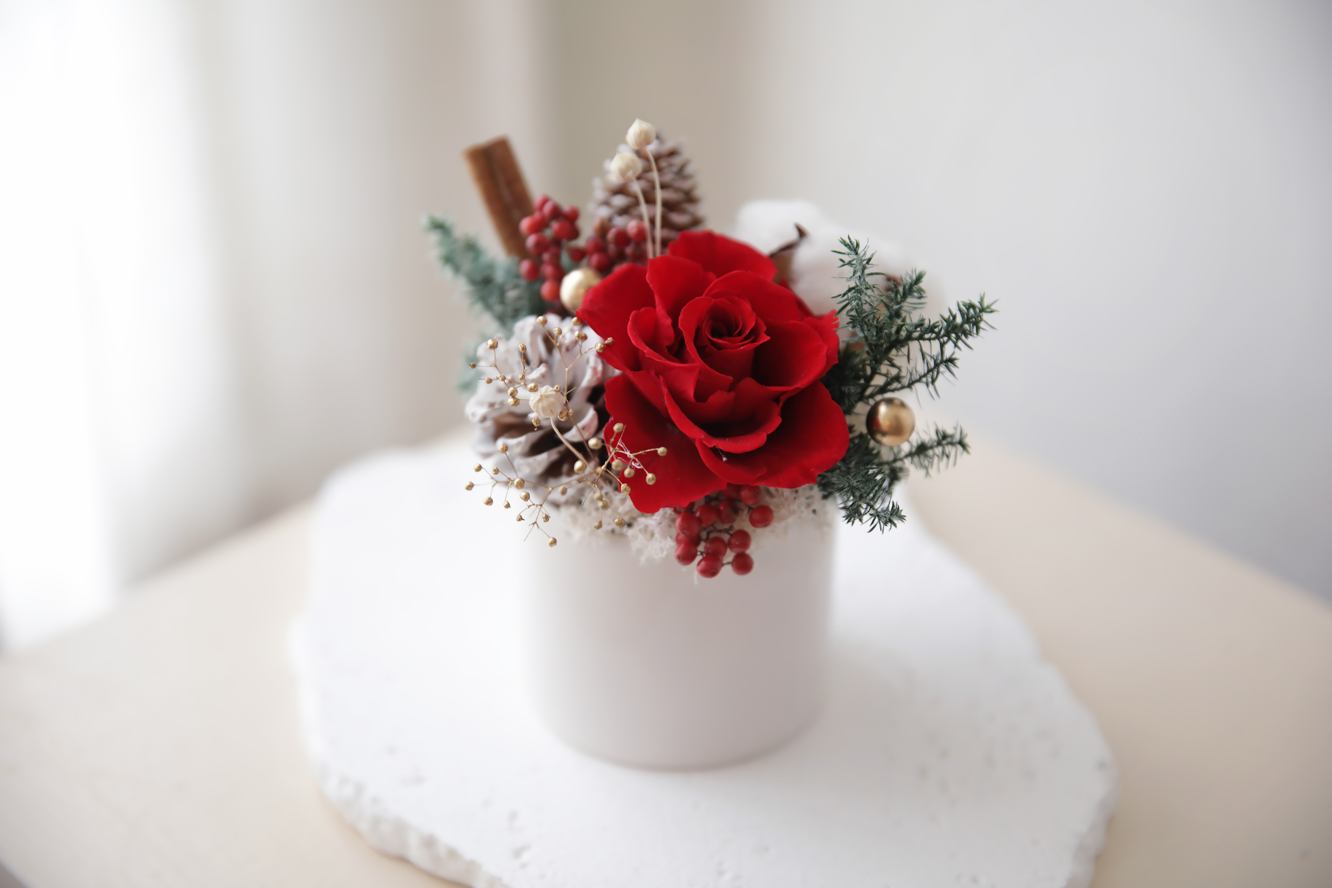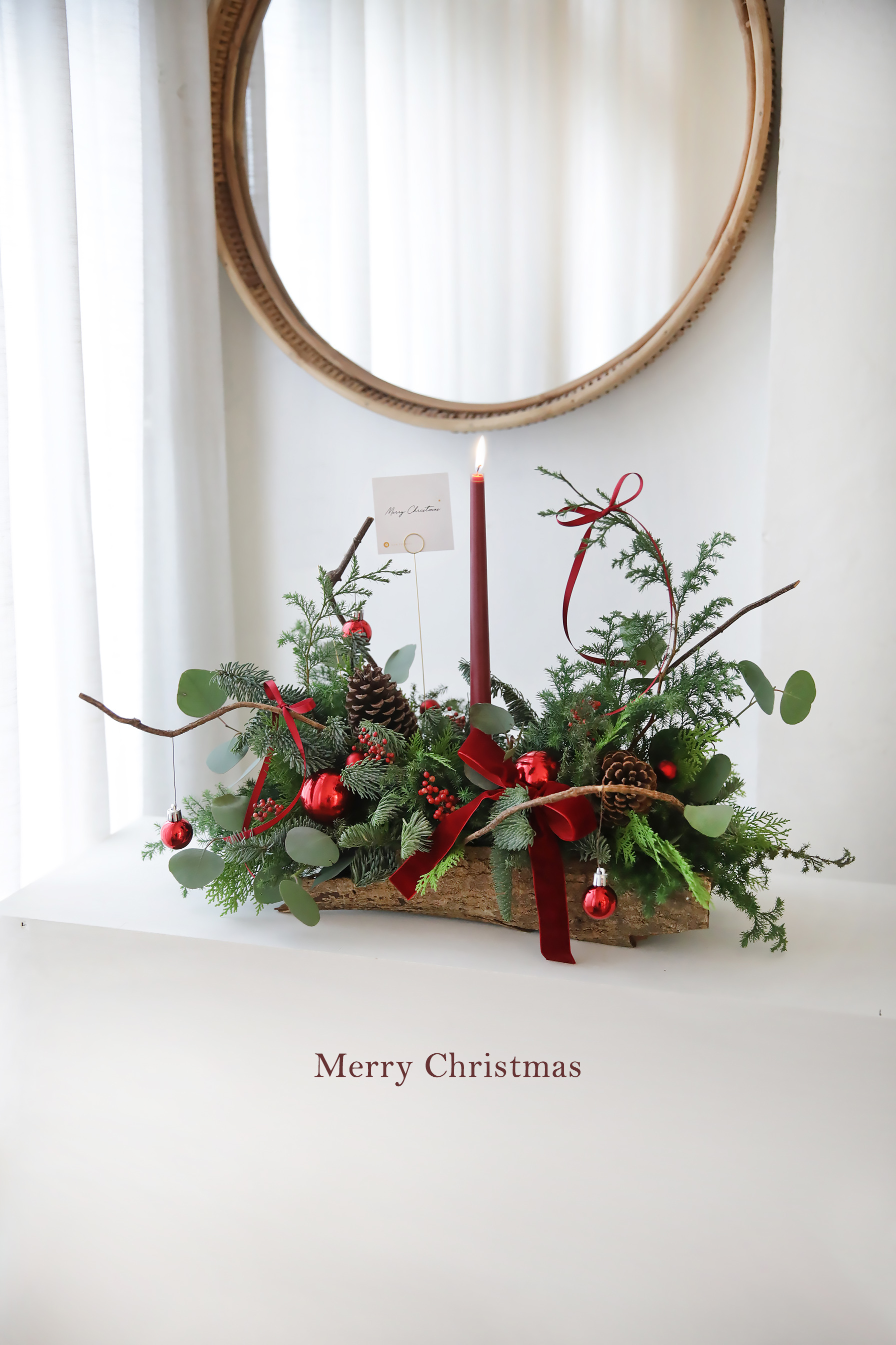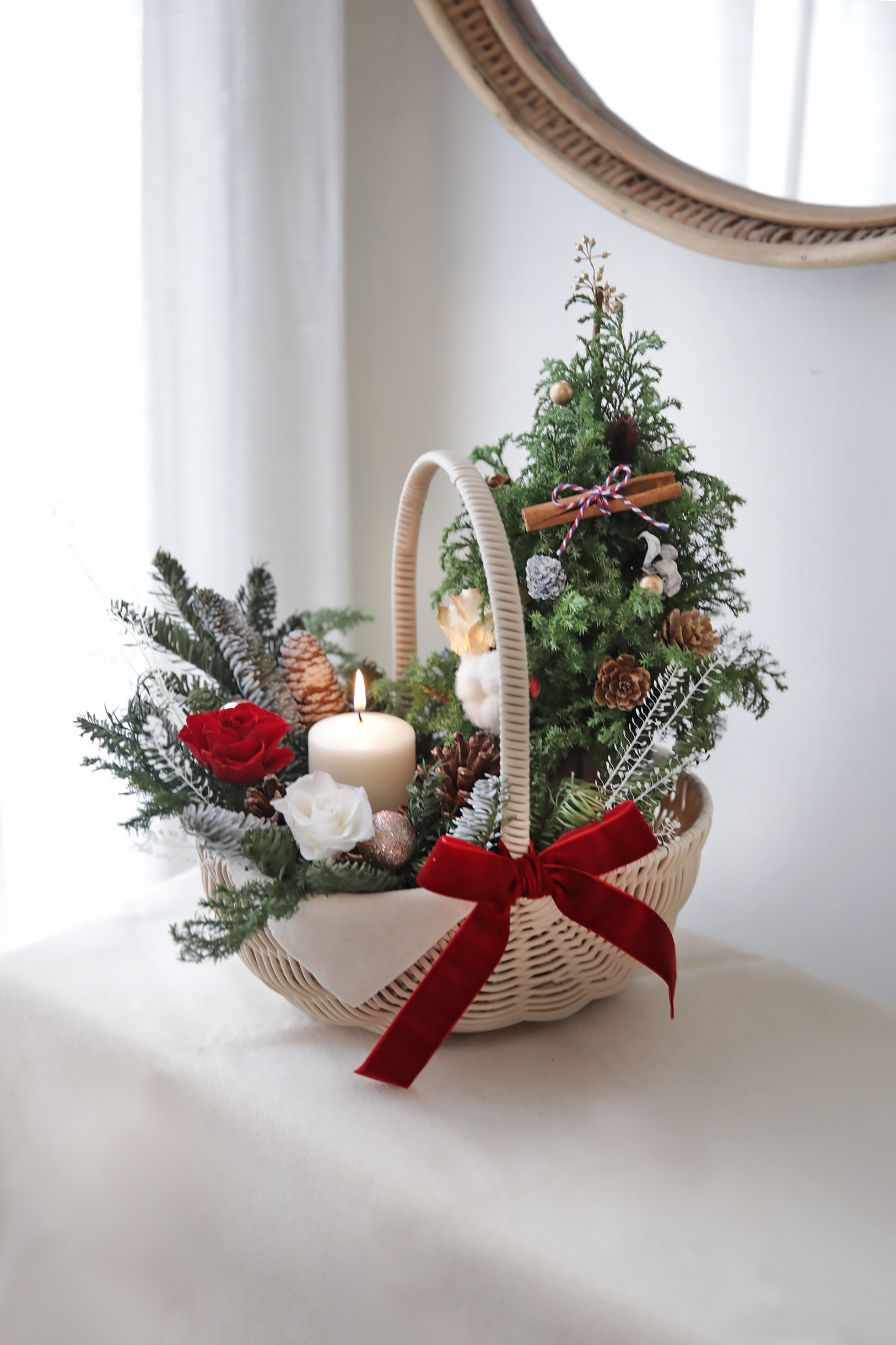 使用可乾燥的新鮮雪松,製作屬於自己的聖誕樹,並將果實與聖誕花材一起裝飾溫暖的聖誕提籃花!
