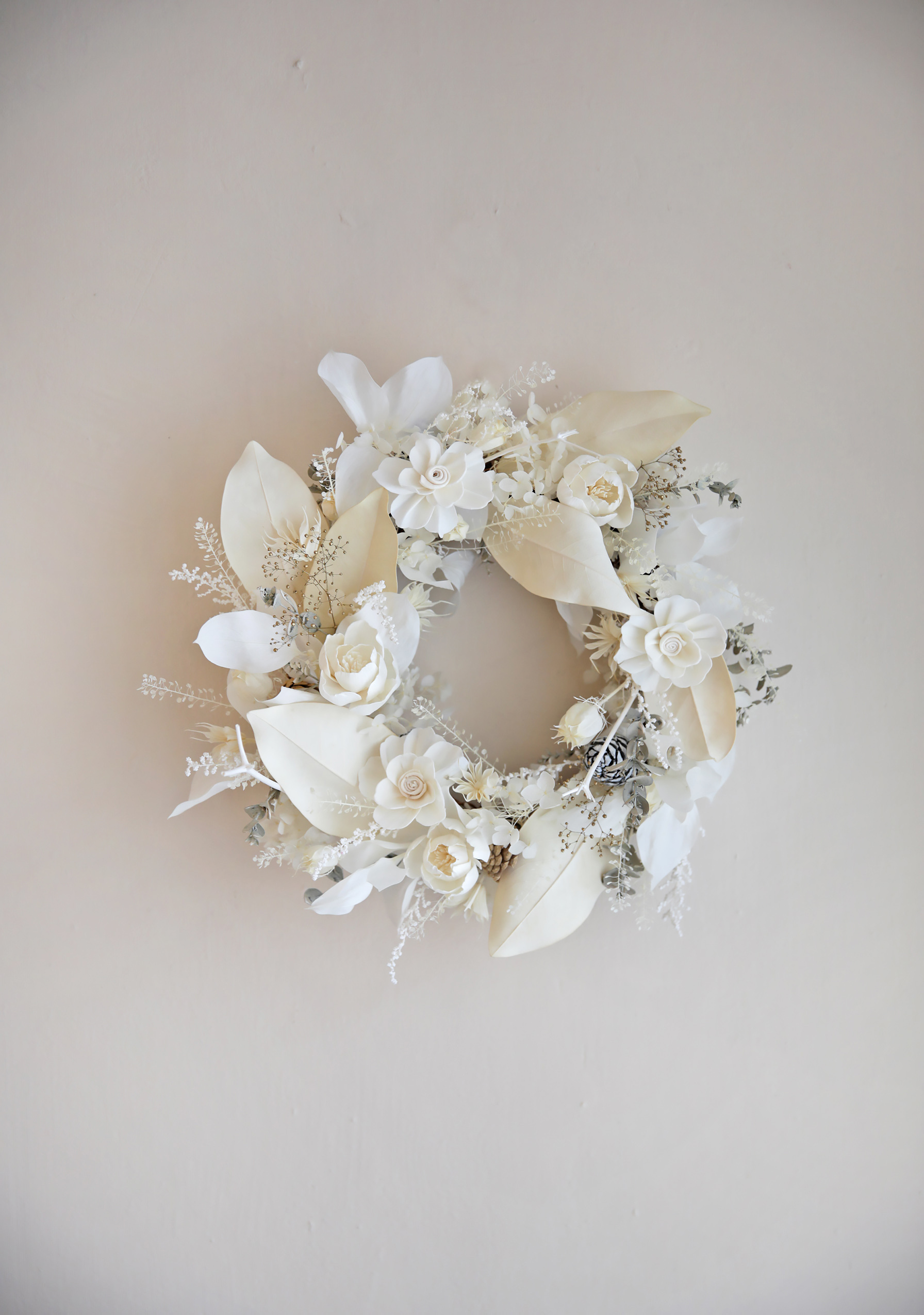 白色是浪漫冬天裡最迷人的顏色,讓我們一起將純白色系的花材,編織出屬於這個季節的浪漫花圈。