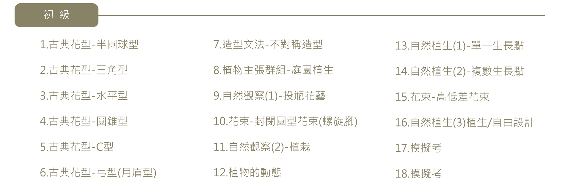從零開始,包含花藝與植物的基礎知識、經典歐式古典花型、自然觀察與造型文法,最後進入自然植生與手綁花束。
