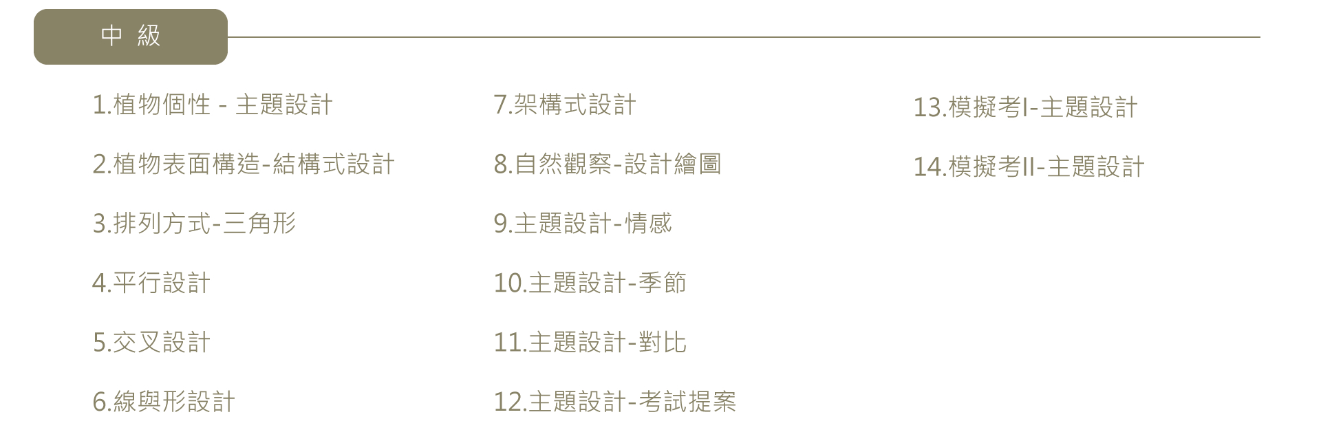 中級課程為「 主題式發想呈現 」與「 各種設計技巧運用」的訓練,包含結構式、水平、交叉、線與形等,培養同學自主創作設計與挑選花材的能力。